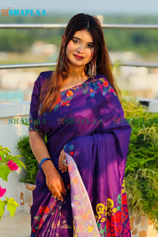 এমব্রয়ডারি করে মিরর বসানো সুন্দর ডিজাইনের চান্দেরি সিল্ক শাড়ি।