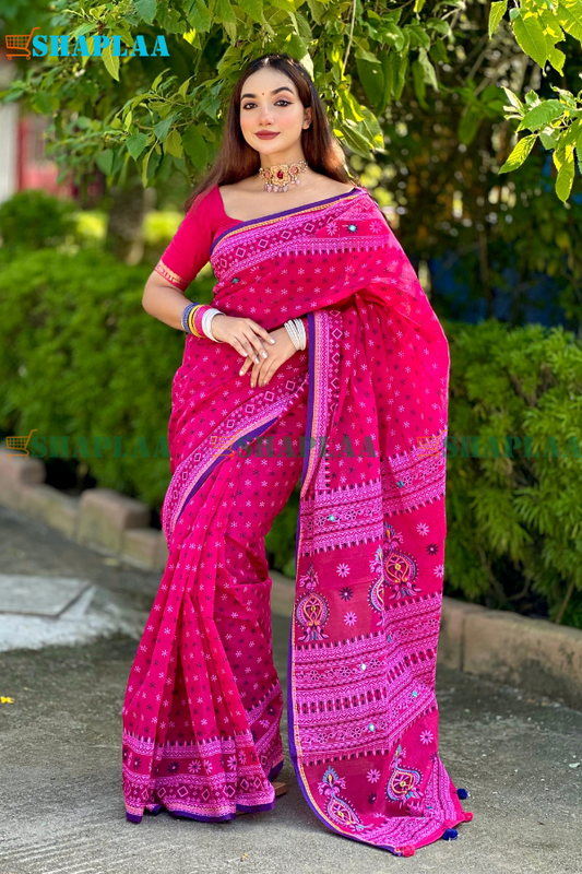 এমব্রয়ডারি করে মিরর বসানো সুন্দর ডিজাইনের চান্দেরি সিল্ক শাড়ি।