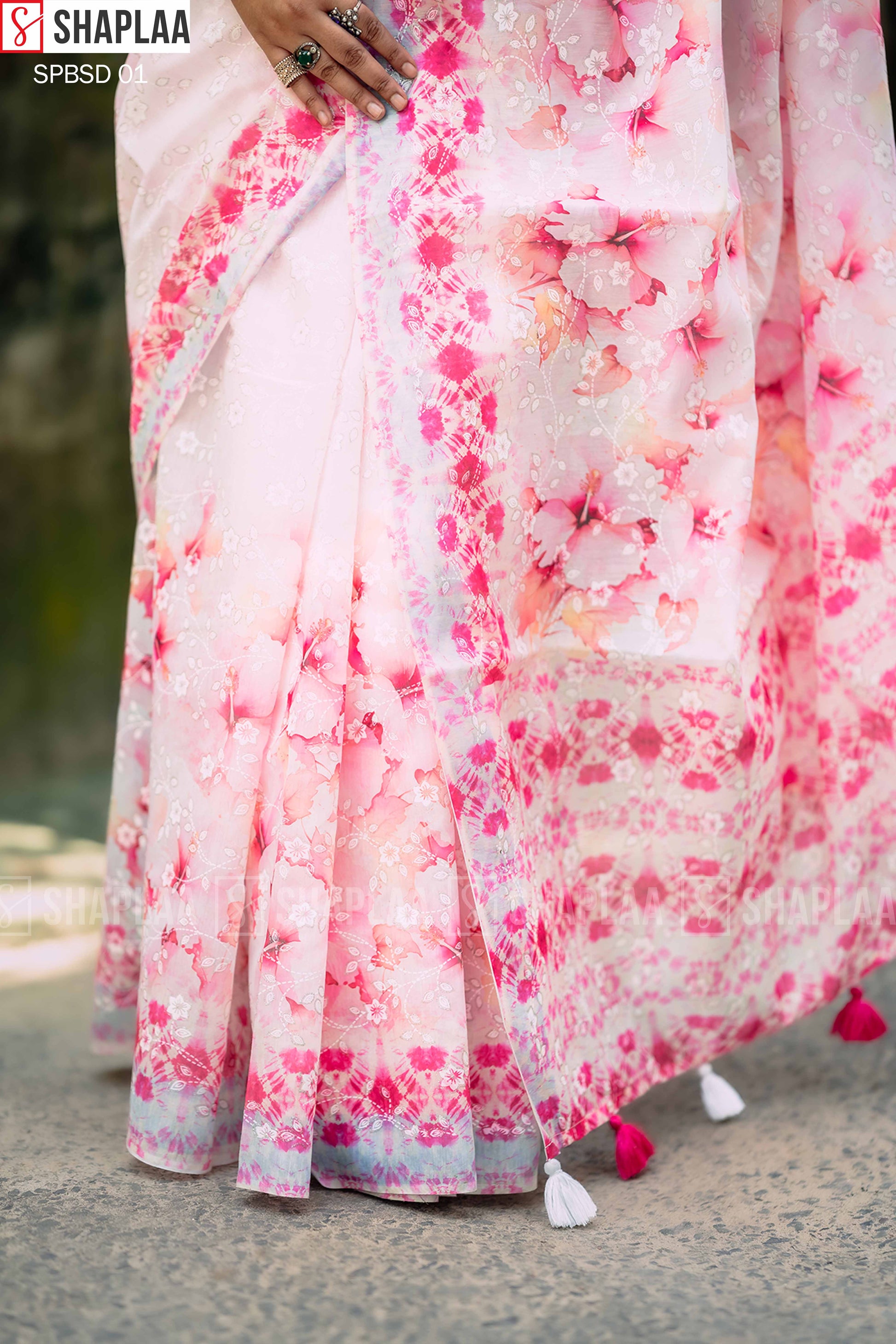 *** ডিজাইন: ফুল বডি ডিজিটাল প্রিন্ট ও জড়ির কাজ করা এবং আঁচলে রয়েছে উন্নতমানের পুথি টার্সেল করা ।